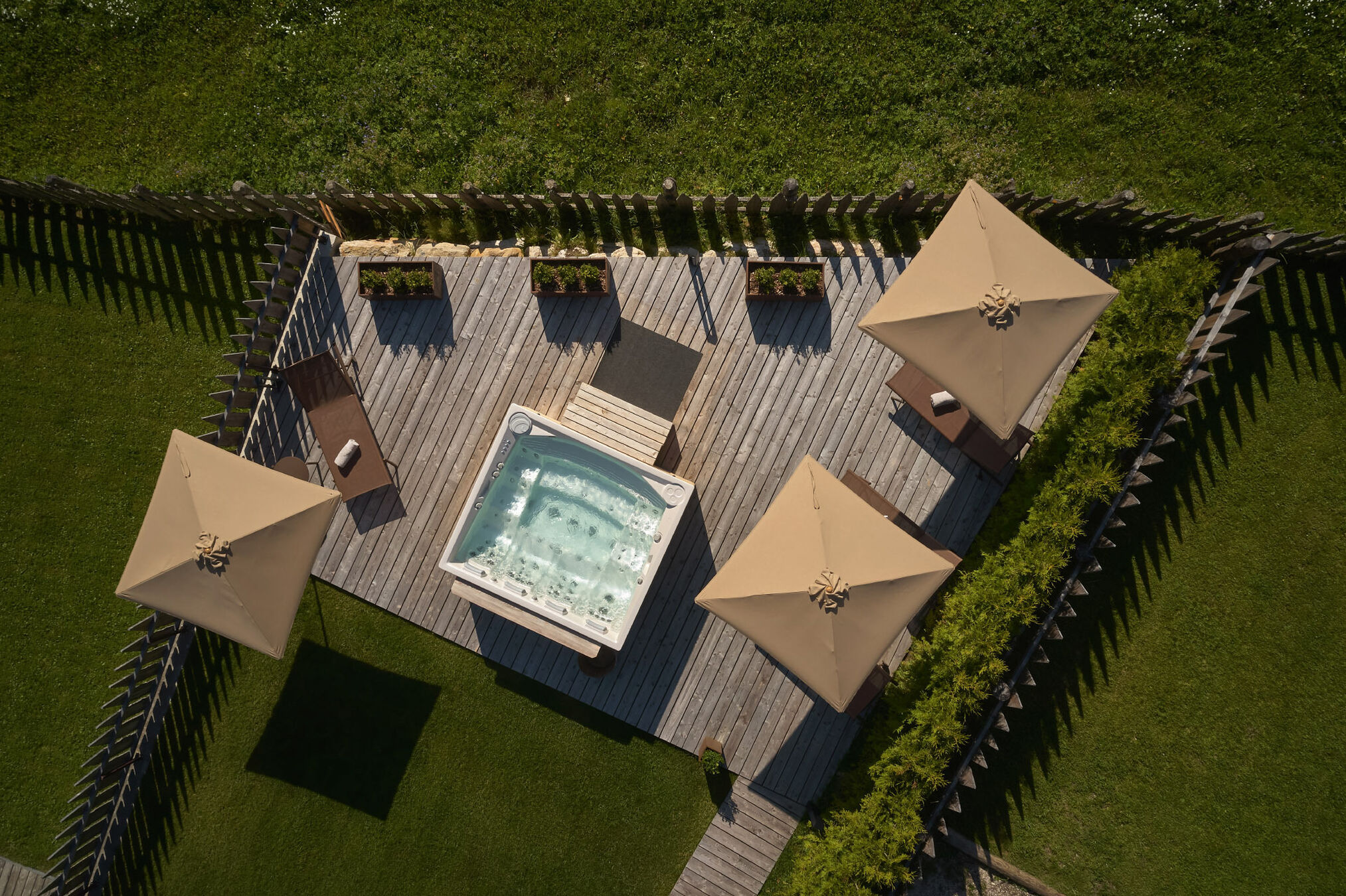Vi aspetterá un ampio giardino panoramico con idromassaggio lounge, riscaldato durante tutto l’anno (37 gradi) con una vista spettacolare